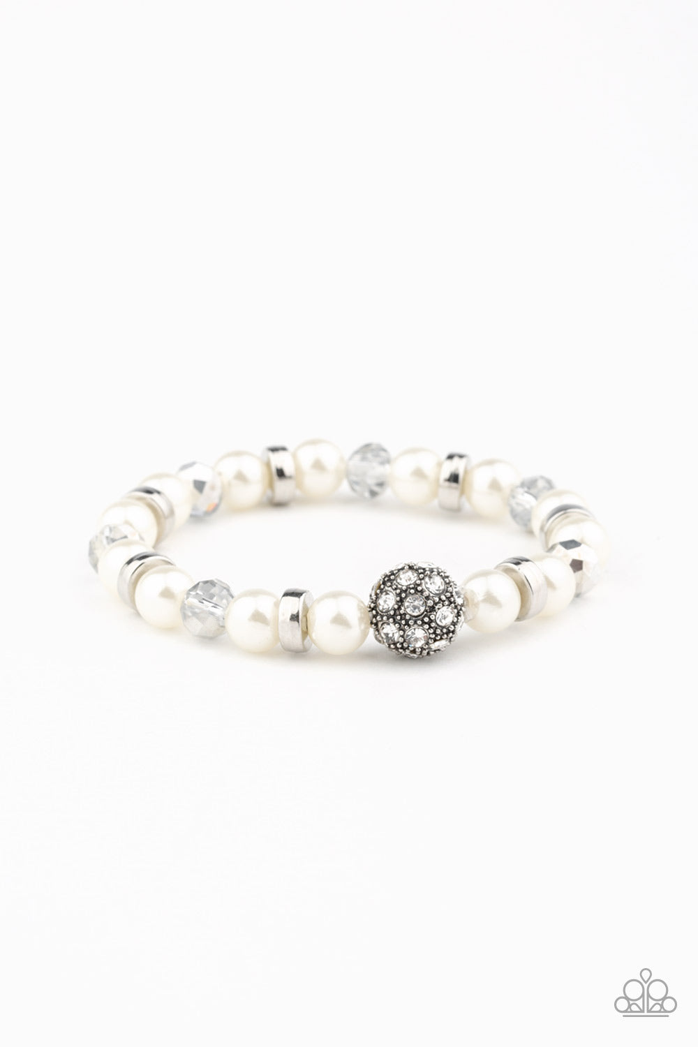 A refined collection of white pearls, metallic crystal-like beads, shimmery silver accents, and a white rhinestone encrusted bead are threaded along a stretchy band around the wrist for a timeless look.